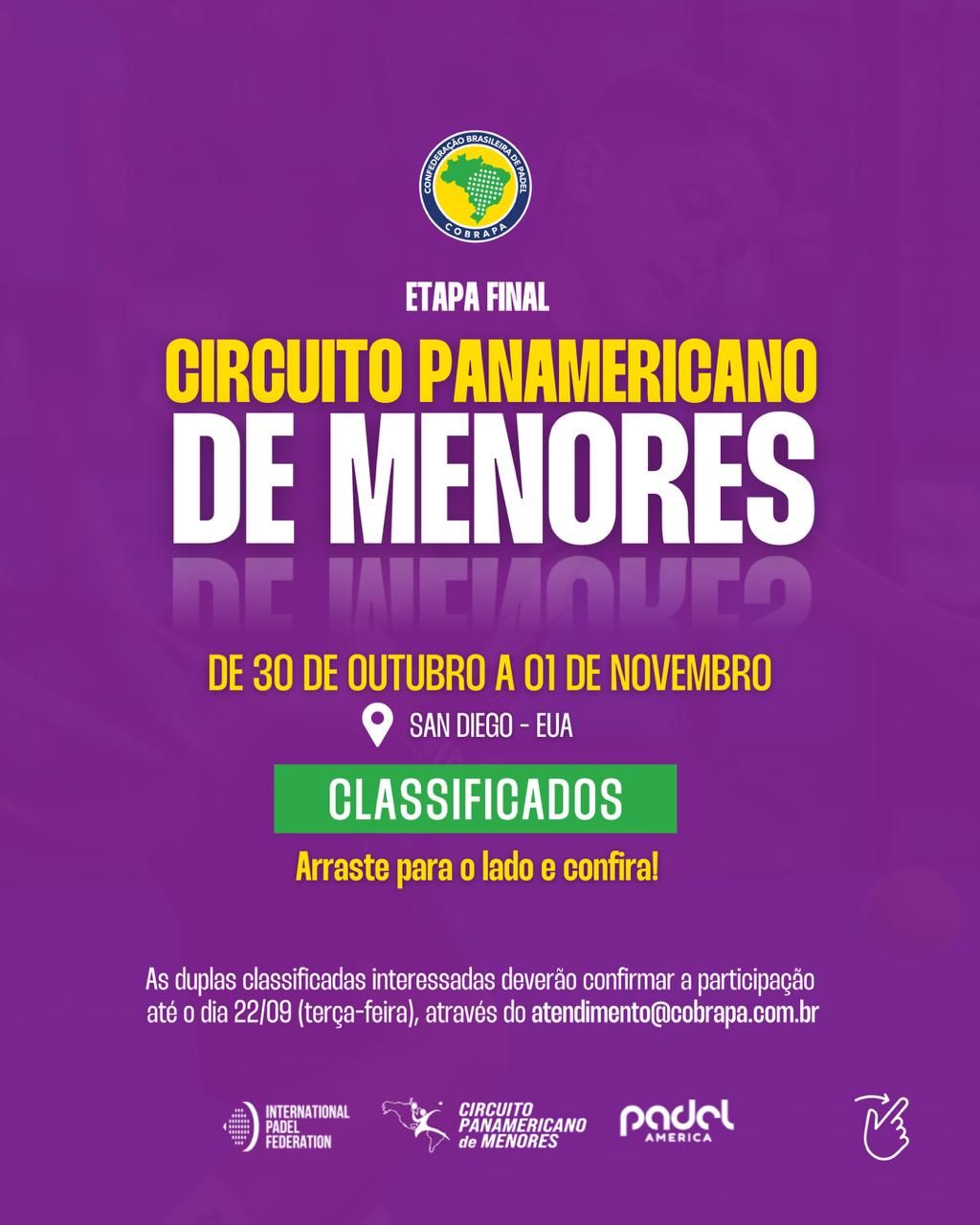 *As duplas classificadas interessadas deverão enviar um e-mail para atendimento@cobrapa.com.br confirmando a participação até 22/09.